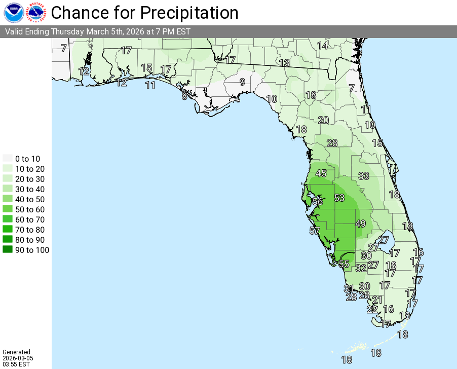 TAMPA BAY, Florida – The National Weather Service Tampa Bay has issued a weather outlook for West Central Florida on Thursday, March 5, 2026, indicating increased chances of showers and thunderstorms this afternoon and evening.