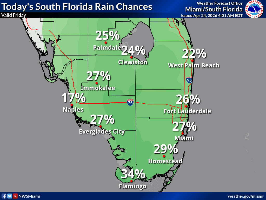 MIAMI, Florida – The National Weather Service in Miami forecasts that scattered showers and isolated thunderstorms remain possible across South Florida today, with the best chances during the afternoon hours on Friday, April 24, 2026.