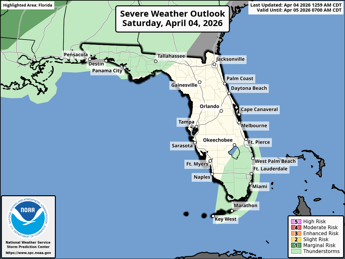 National Weather Service Storm Prediction Center Severe Weather Outlook for Florida on Saturday, April 04, 2026.