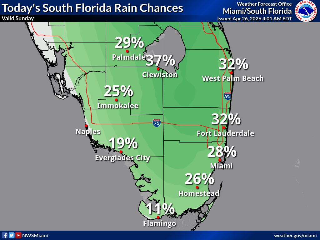 The highest rain chances are inland and along the east coast: 37% Clewiston, 32% West Palm Beach, 32% Fort Lauderdale, 29% Palmdale, 28% Miami, 26% Homestead, 25% Immokalee, 19% Everglades City / Naples area, and 11% Flamingo.